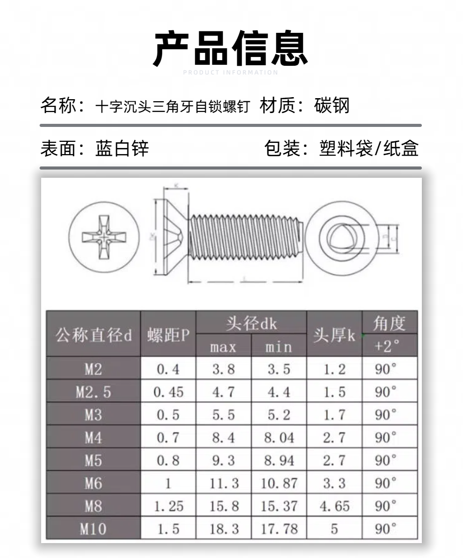 蓝白锌十字沉头三角牙自锁螺钉介绍